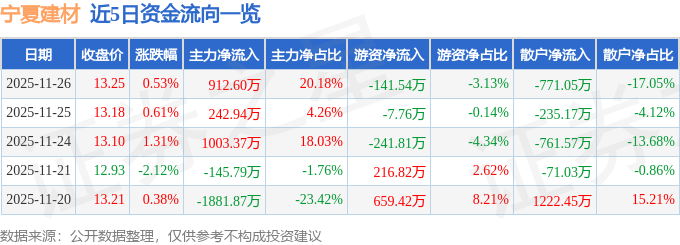 证券之星消息,截至2025年11月26日收盘,宁夏建材(600449)报收于13.25元,上涨0.53%,换手率0.72%,成交量3.42万手,成交额4522.53万元。