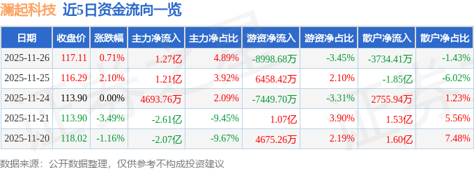 证券之星消息,截至2025年11月26日收盘,澜起科技(688008)报收于117.11元,上涨0.71%,换手率1.94%,成交量22.18万手,成交额26.05亿元。