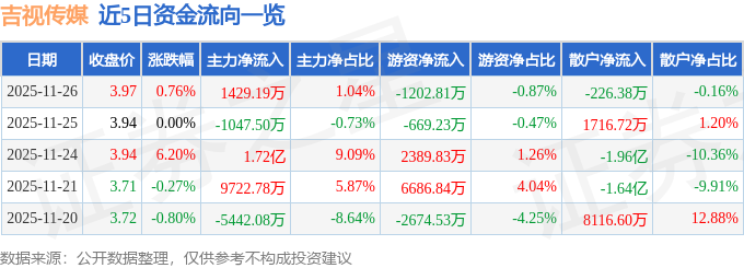 证券之星消息,截至2025年11月26日收盘,吉视传媒(601929)报收于3.97元,上涨0.76%,换手率9.97%,成交量347.92万手,成交额13.76亿元。