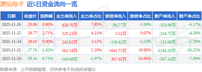 证券之星消息,截至2025年11月26日收盘,澳弘电子(605058)报收于29.0元,上涨0.8%,换手率1.39%,成交量1.98万手,成交额5738.99万元。