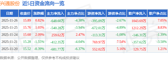 证券之星消息,截至2025年11月26日收盘,兴通股份(603209)报收于15.89元,上涨0.82%,换手率3.31%,成交量9.27万手,成交额1.48亿元。