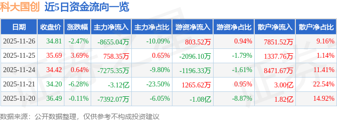 证券之星消息,截至2025年11月26日收盘,科大国创(300520)报收于34.81元,下跌2.47%,换手率8.8%,成交量24.46万手,成交额8.57亿元。