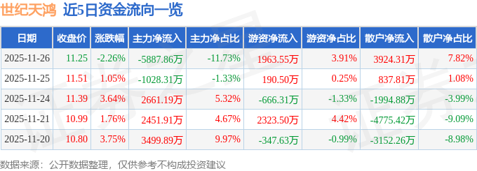 证券之星消息,截至2025年11月26日收盘,世纪天鸿(300654)报收于11.25元,下跌2.26%,换手率12.6%,成交量44.37万手,成交额5.02亿元。