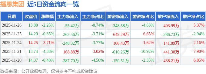 证券之星消息,截至2025年11月26日收盘,播恩集团(001366)报收于13.88元,下跌2.25%,换手率9.72%,成交量5.41万手,成交额7529.09万元。