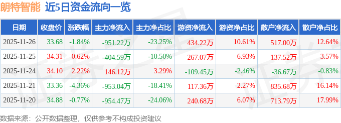 证券之星消息,截至2025年11月26日收盘,朗特智能(300916)报收于33.68元,下跌1.84%,换手率1.29%,成交量1.2万手,成交额4090.76万元。