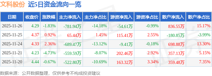 证券之星消息,截至2025年11月26日收盘,文科股份(002775)报收于4.29元,下跌1.83%,换手率2.68%,成交量12.66万手,成交额5514.55万元。
