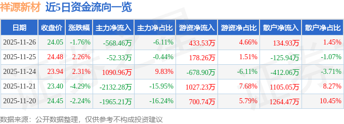证券之星消息,截至2025年11月26日收盘,祥源新材(300980)报收于24.05元,下跌1.76%,换手率3.91%,成交量3.84万手,成交额9306.07万元。