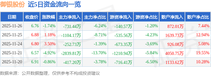 证券之星消息,截至2025年11月26日收盘,御银股份(002177)报收于6.76元,下跌1.74%,换手率2.55%,成交量17.18万手,成交额1.17亿元。