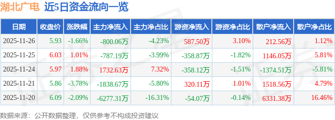 证券之星消息,截至2025年11月26日收盘,湖北广电(000665)报收于5.93元,下跌1.66%,换手率2.78%,成交量31.66万手,成交额1.89亿元。