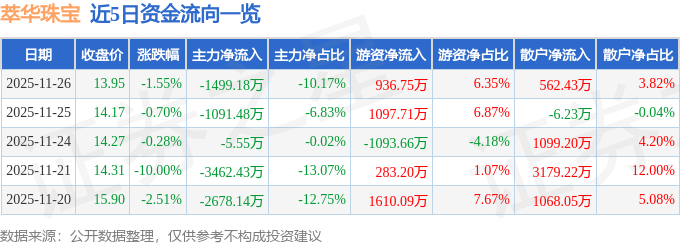 证券之星消息,截至2025年11月26日收盘,萃华珠宝(002731)报收于13.95元,下跌1.55%,换手率4.53%,成交量10.41万手,成交额1.47亿元。