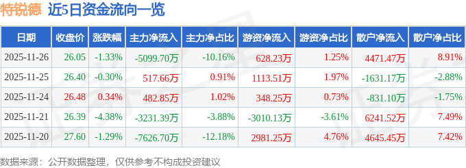 证券之星消息,截至2025年11月26日收盘,特锐德(300001)报收于26.05元,下跌1.33%,换手率1.86%,成交量19.16万手,成交额5.02亿元。
