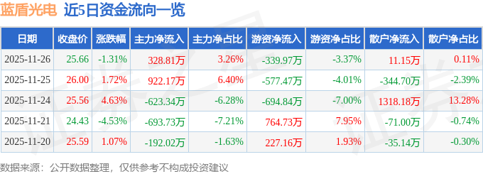 证券之星消息,截至2025年11月26日收盘,蓝盾光电(300862)报收于25.66元,下跌1.31%,换手率2.58%,成交量3.91万手,成交额1.01亿元。