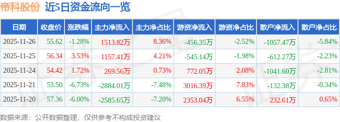证券之星消息,截至2025年11月26日收盘,帝科股份(300842)报收于55.62元,下跌1.28%,换手率2.5%,成交量3.24万手,成交额1.81亿元。
