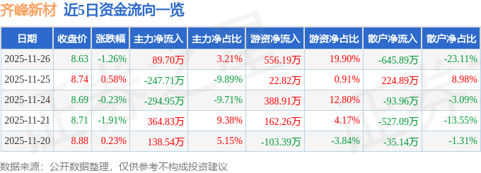 证券之星消息,截至2025年11月26日收盘,齐峰新材(002521)报收于8.63元,下跌1.26%,换手率0.77%,成交量3.22万手,成交额2794.92万元。
