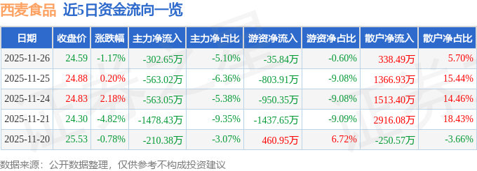 证券之星消息,截至2025年11月26日收盘,西麦食品(002956)报收于24.59元,下跌1.17%,换手率1.07%,成交量2.39万手,成交额5939.99万元。