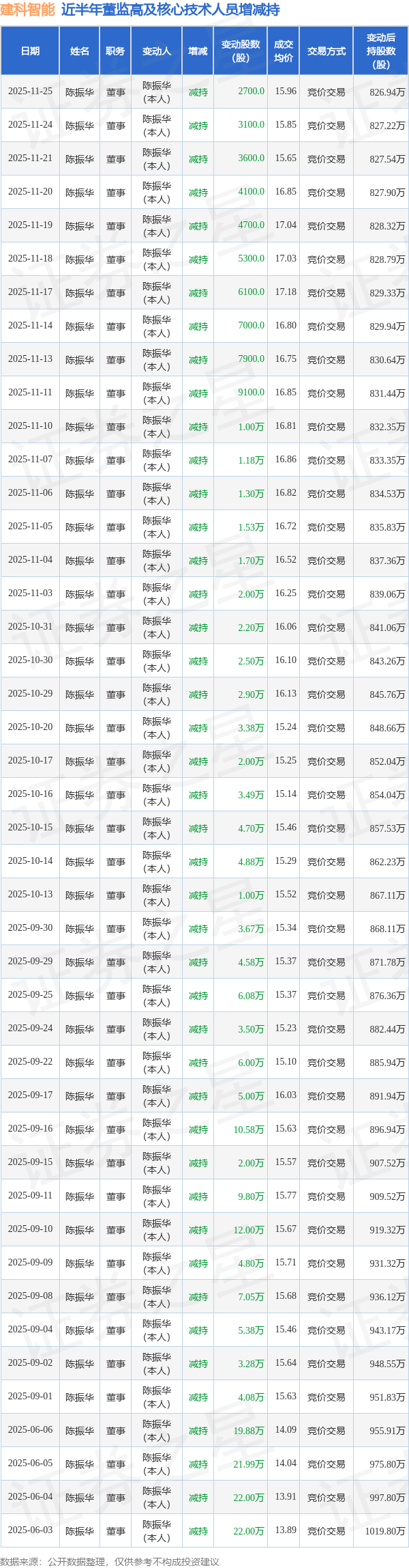 建科智能近半年内的董监高及核心技术人员增减持详情如下: