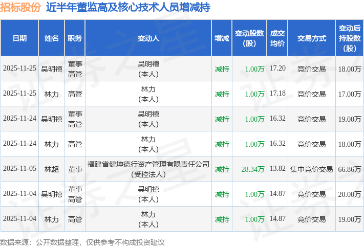 招标股份近半年内的董监高及核心技术人员增减持详情如下: