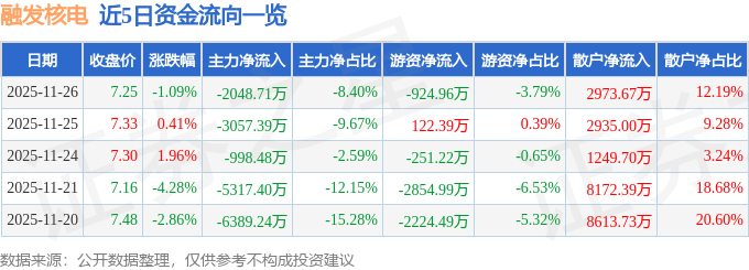 证券之星消息,截至2025年11月26日收盘,融发核电(002366)报收于7.25元,下跌1.09%,换手率2.67%,成交量33.52万手,成交额2.44亿元。