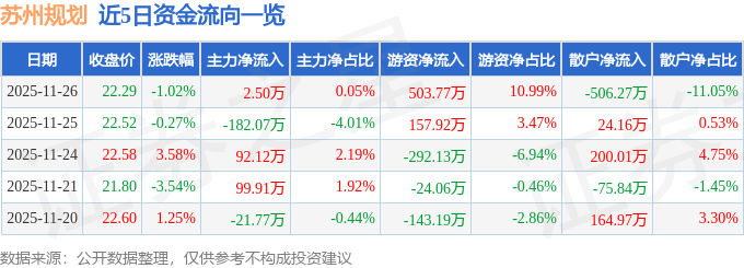 证券之星消息,截至2025年11月26日收盘,苏州规划(301505)报收于22.29元,下跌1.02%,换手率2.7%,成交量2.02万手,成交额4582.45万元。