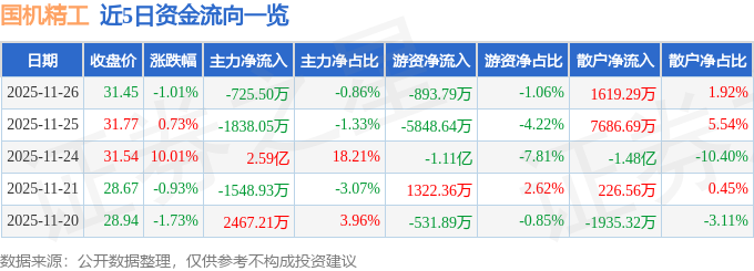 证券之星消息,截至2025年11月26日收盘,国机精工(002046)报收于31.45元,下跌1.01%,换手率5.05%,成交量26.69万手,成交额8.42亿元。