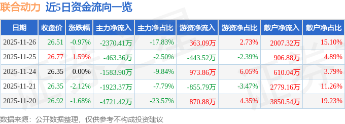 证券之星消息,截至2025年11月26日收盘,联合动力(301656)报收于26.51元,下跌0.97%,换手率2.99%,成交量4.99万手,成交额1.33亿元。