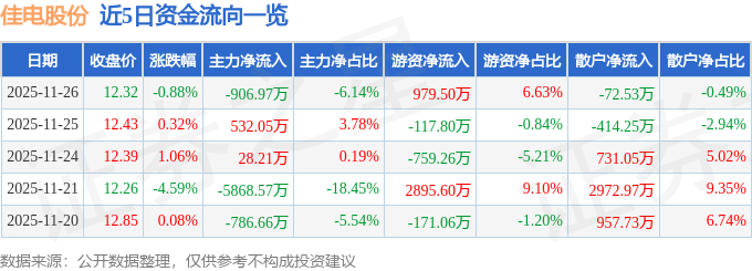 11月26日的资金流向数据方面,主力资金净流出906.97万元,占总成交额6.14%,游资资金净流入979.5万元,占总成交额6.63%,散户资金净流出72.53万元,占总成交额0.49%。