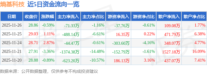 证券之星消息,截至2025年11月26日收盘,熵基科技(301330)报收于28.86元,下跌0.59%,换手率1.86%,成交量2.12万手,成交额6163.26万元。