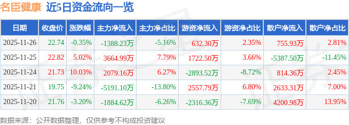 证券之星消息,截至2025年11月26日收盘,名臣健康(002919)报收于22.74元,下跌0.35%,换手率4.48%,成交量11.84万手,成交额2.69亿元。