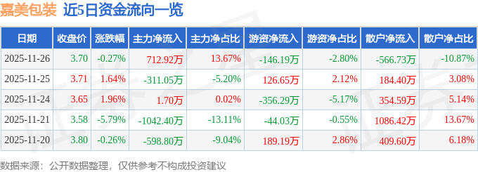 证券之星消息,截至2025年11月26日收盘,嘉美包装(002969)报收于3.7元,下跌0.27%,换手率1.48%,成交量14.05万手,成交额5215.64万元。