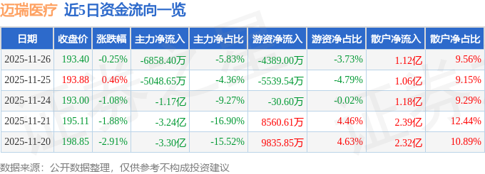 证券之星消息,截至2025年11月26日收盘,迈瑞医疗(300760)报收于193.4元,下跌0.25%,换手率0.5%,成交量6.08万手,成交额11.76亿元。