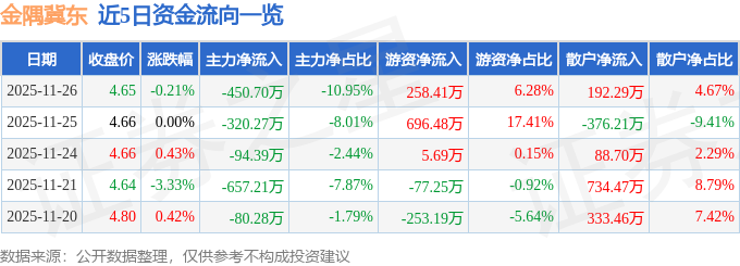 11月26日的资金流向数据方面,主力资金净流出450.7万元,占总成交额10.95%,游资资金净流入258.41万元,占总成交额6.28%,散户资金净流入192.29万元,占总成交额4.67%。