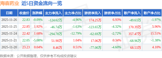 证券之星消息,截至2025年11月26日收盘,海森药业(001367)报收于22.83元,下跌0.09%,换手率2.76%,成交量1.1万手,成交额2512.94万元。