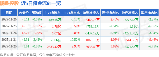 证券之星消息,截至2025年11月26日收盘,鹏鼎控股(002938)报收于45.11元,下跌0.09%,换手率1.38%,成交量31.82万手,成交额14.43亿元。