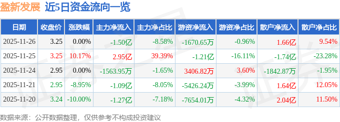 证券之星消息,截至2025年11月26日收盘,盈新发展(000620)报收于3.25元,上涨0.0%,换手率11.32%,成交量528.68万手,成交额17.42亿元。