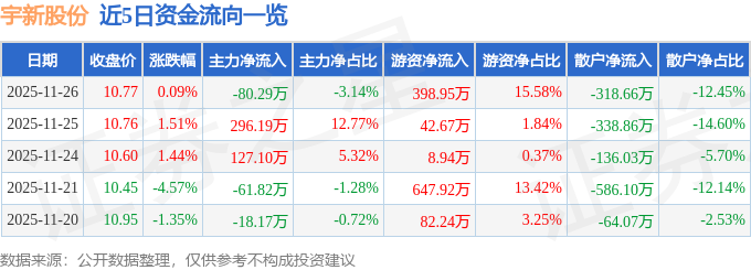 证券之星消息,截至2025年11月26日收盘,宇新股份(002986)报收于10.77元,上涨0.09%,换手率0.78%,成交量2.36万手,成交额2560.31万元。