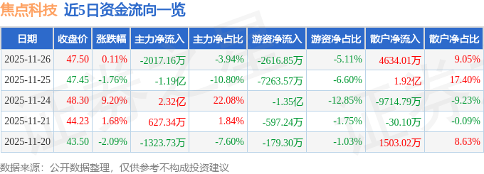 证券之星消息,截至2025年11月26日收盘,焦点科技(002315)报收于47.5元,上涨0.11%,换手率5.28%,成交量10.68万手,成交额5.12亿元。
