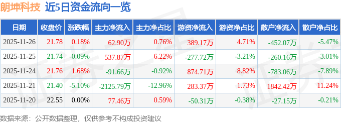 证券之星消息,截至2025年11月26日收盘,朗坤科技(301305)报收于21.78元,上涨0.18%,换手率3.05%,成交量3.78万手,成交额8261.13万元。