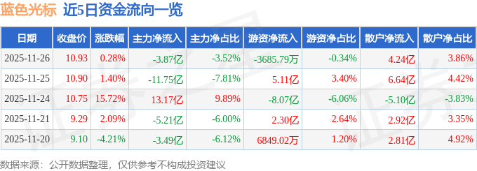证券之星消息,截至2025年11月26日收盘,蓝色光标(300058)报收于10.93元,上涨0.28%,换手率28.51%,成交量992.06万手,成交额109.8亿元。