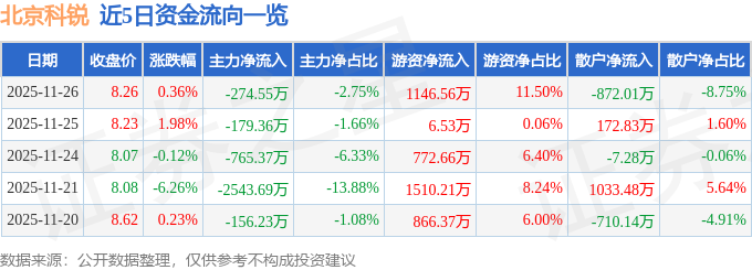 11月26日的资金流向数据方面,主力资金净流出274.55万元,占总成交额2.75%,游资资金净流入1146.56万元,占总成交额11.5%,散户资金净流出872.01万元,占总成交额8.75%。