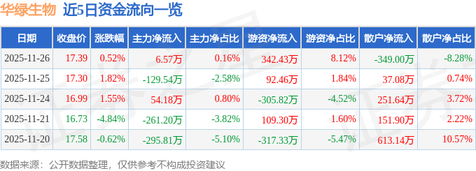 证券之星消息,截至2025年11月26日收盘,华绿生物(300970)报收于17.39元,上涨0.52%,换手率2.57%,成交量2.44万手,成交额4216.45万元。