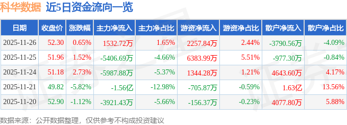 证券之星消息,截至2025年11月26日收盘,科华数据(002335)报收于52.3元,上涨0.65%,换手率3.88%,成交量17.64万手,成交额9.27亿元。
