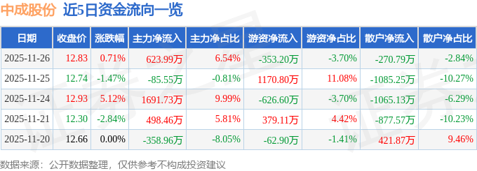 证券之星消息,截至2025年11月26日收盘,中成股份(000151)报收于12.83元,上涨0.71%,换手率2.4%,成交量7.39万手,成交额9546.41万元。