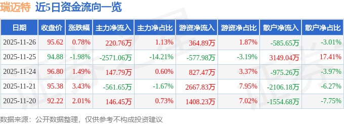 证券之星消息,截至2025年11月26日收盘,瑞迈特(301367)报收于95.62元,上涨0.78%,换手率2.9%,成交量2.03万手,成交额1.95亿元。
