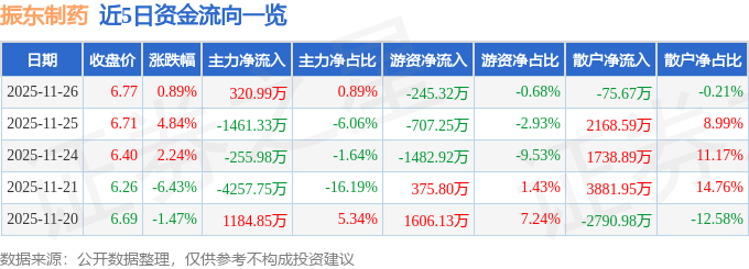 证券之星消息,截至2025年11月26日收盘,振东制药(300158)报收于6.77元,上涨0.89%,换手率5.25%,成交量52.04万手,成交额3.6亿元。
