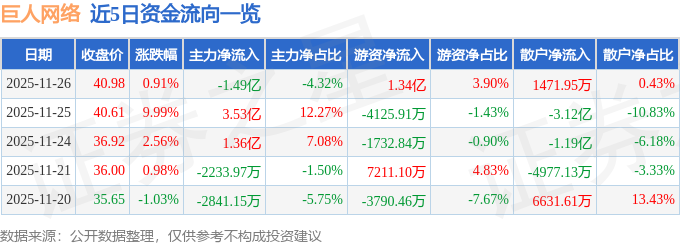 证券之星消息,截至2025年11月26日收盘,巨人网络(002558)报收于40.98元,上涨0.91%,换手率4.3%,成交量83.17万手,成交额34.4亿元。
