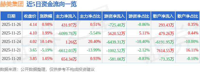 证券之星消息,截至2025年11月26日收盘,赫美集团(002356)报收于4.14元,上涨0.98%,换手率15.31%,成交量200.79万手,成交额8.4亿元。