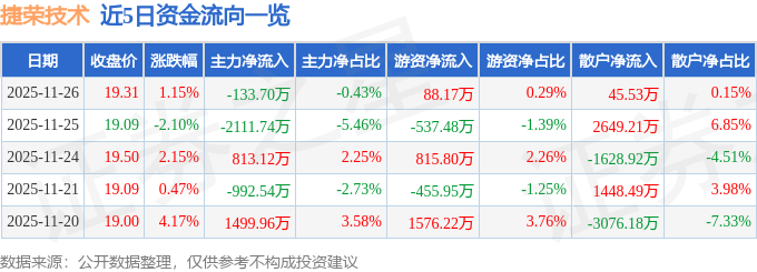 证券之星消息,截至2025年11月26日收盘,捷荣技术(002855)报收于19.31元,上涨1.15%,换手率6.62%,成交量16.3万手,成交额3.08亿元。