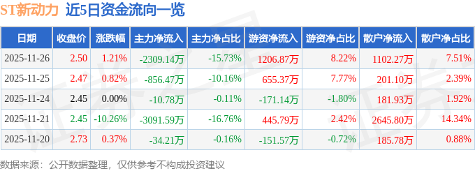 证券之星消息,截至2025年11月26日收盘,ST新动力(300152)报收于2.5元,上涨1.21%,换手率8.36%,成交量59.57万手,成交额1.47亿元。