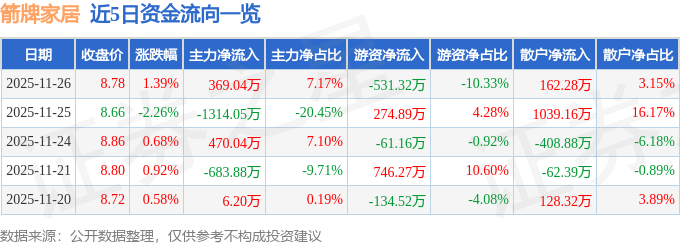 证券之星消息,截至2025年11月26日收盘,箭牌家居(001322)报收于8.78元,上涨1.39%,换手率0.74%,成交量5.85万手,成交额5144.88万元。