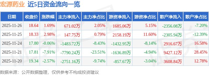 证券之星消息,截至2025年11月26日收盘,宏源药业(301246)报收于18.64元,上涨1.69%,换手率10.72%,成交量17.15万手,成交额3.27亿元。